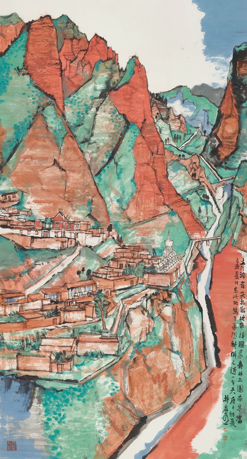 林容生对色彩的运用谨慎而坚定,其筑基于传统金碧青绿,又重视用笔用色过程中出现的随机变幻的效果。他强化色块的大小、形态、强弱对比,丰富视觉效果。