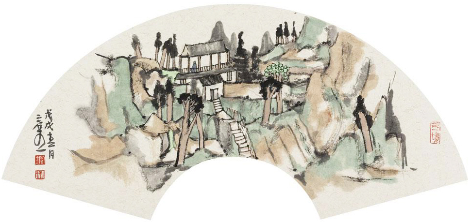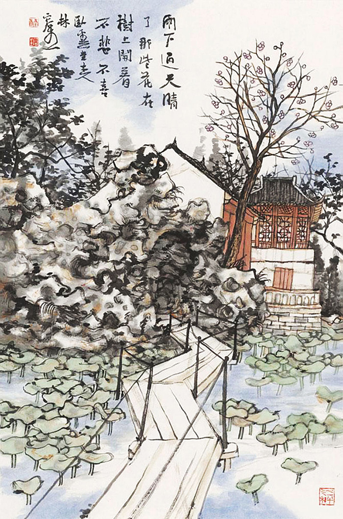 他的作品色与墨泾渭分明,虚实有度,画面跳跃而不凌乱,构成紧凑而富有装饰趣味,清雅与古厚兼备,深远与简淡并存,清疏温润,安然自在,平逸和谐,还弥漫着一种人与自然相依相存的亲切感,展现出独特的东方诗情。
